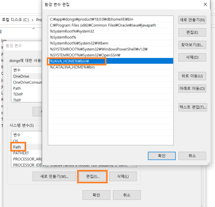 ① 이렇게 리스트 모양으로 뜬다면 새로 만들기를 눌러 %JAVA_HOME%\bin\ 이라고 작성하면 된다.