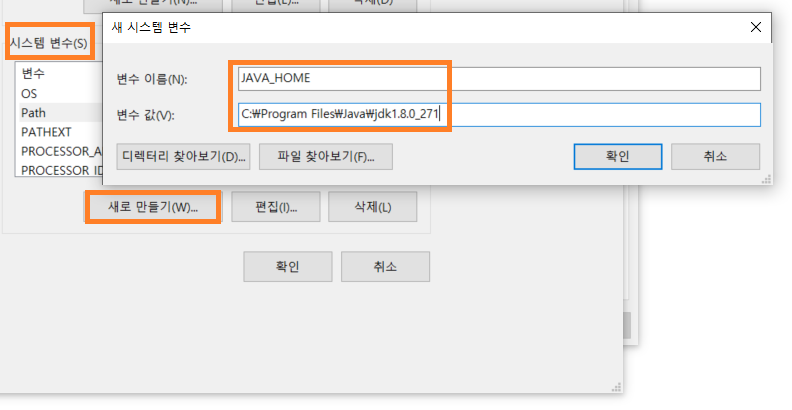 시스템 변수 항목에 새로 만들기 클릭하여 변수 이름은 JAVA_HOME 으로 하고