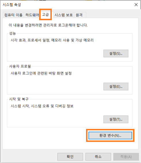 Window + 알파벳 'R' -> sysdm.cpl 입력