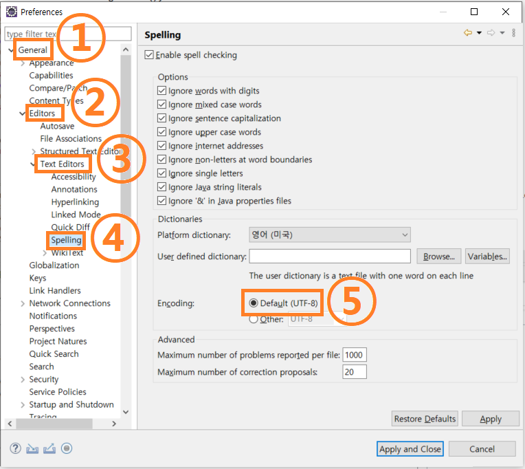 4. General ☞ Editors ☞ Text Edeitors ☞ Spelling ☞ Default (UTF-8) 체크