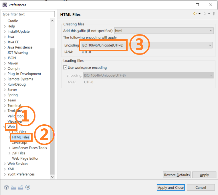 6. Web ☞ HTML Files ☞ Encoding UTF-8 선택