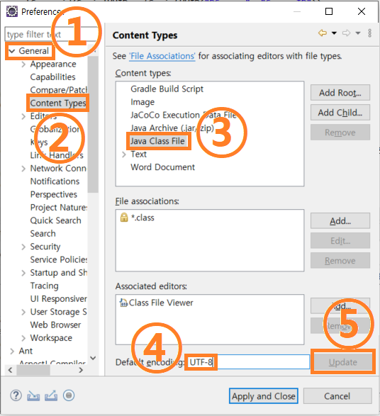 2. General ☞ Content Types ☞ Java Class File ☞ UTF-8 입력 ☞ Udate 클릭
